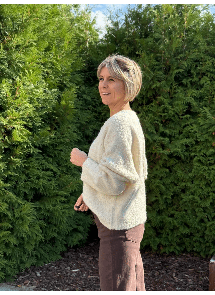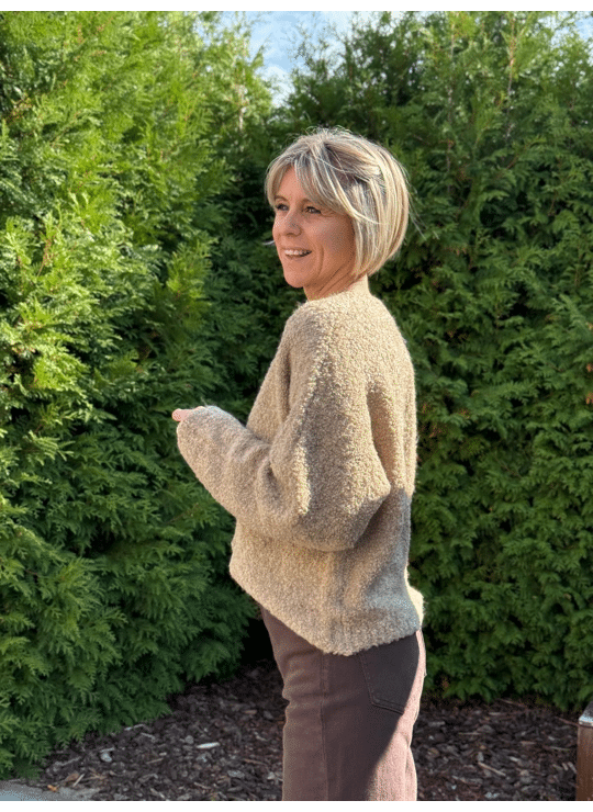 Cardigan met teddy-gehalte, gouden knopen en ronde hals.