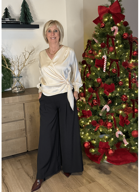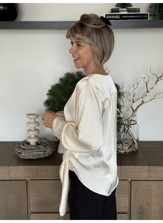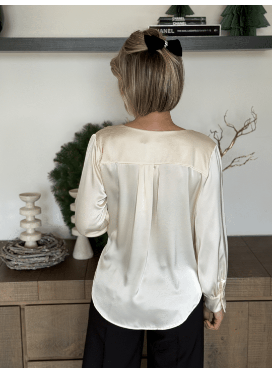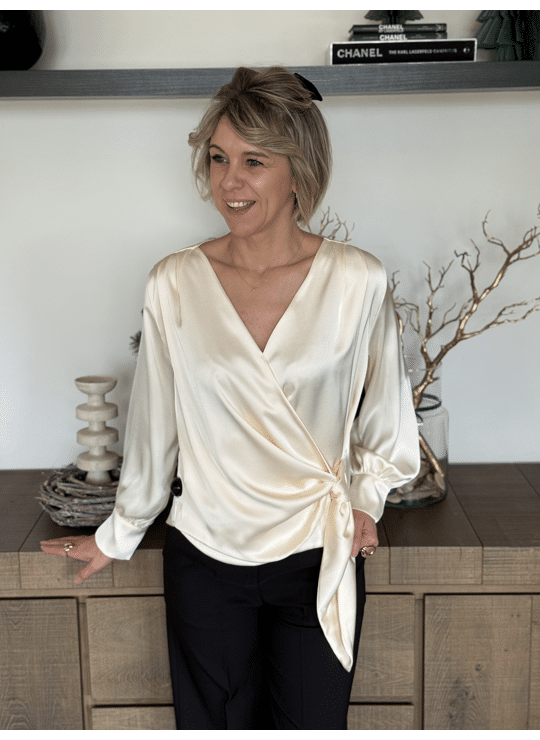 Elegante blouse in satijn look stof met een v-hals met overslag, een knoopdetail in de taille, lange mouwen met brede manchetten.