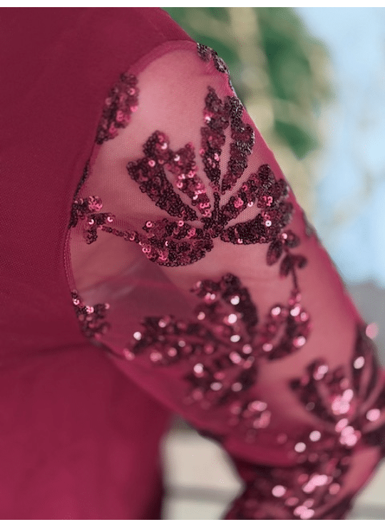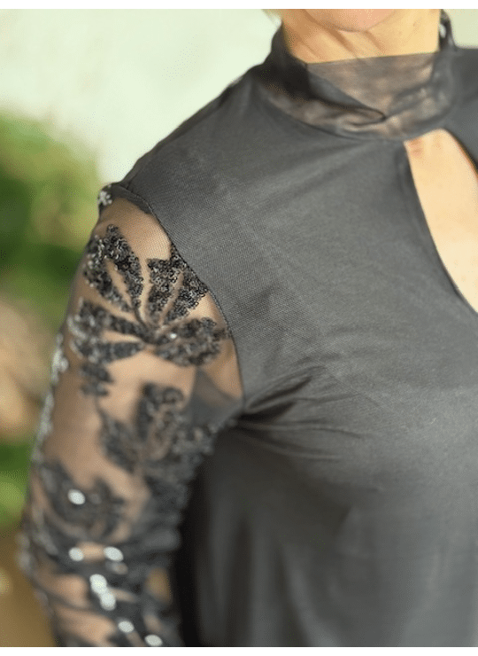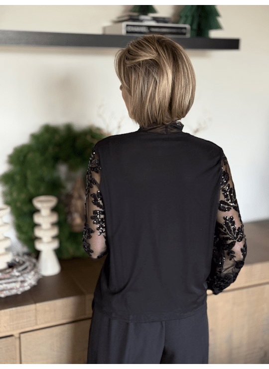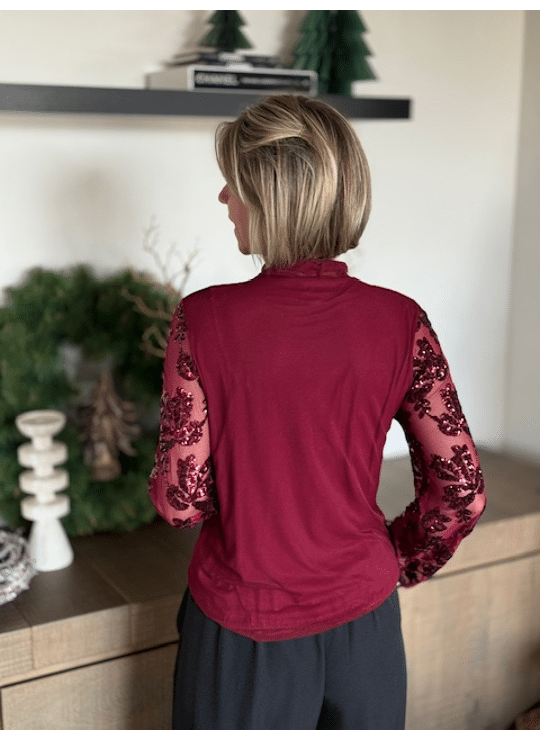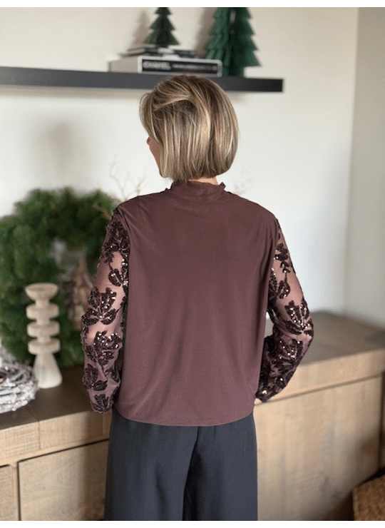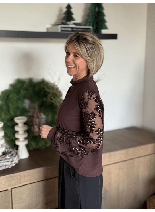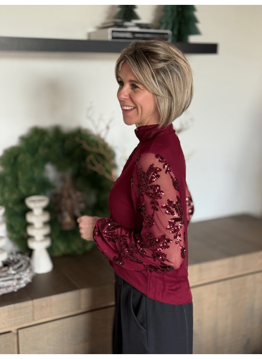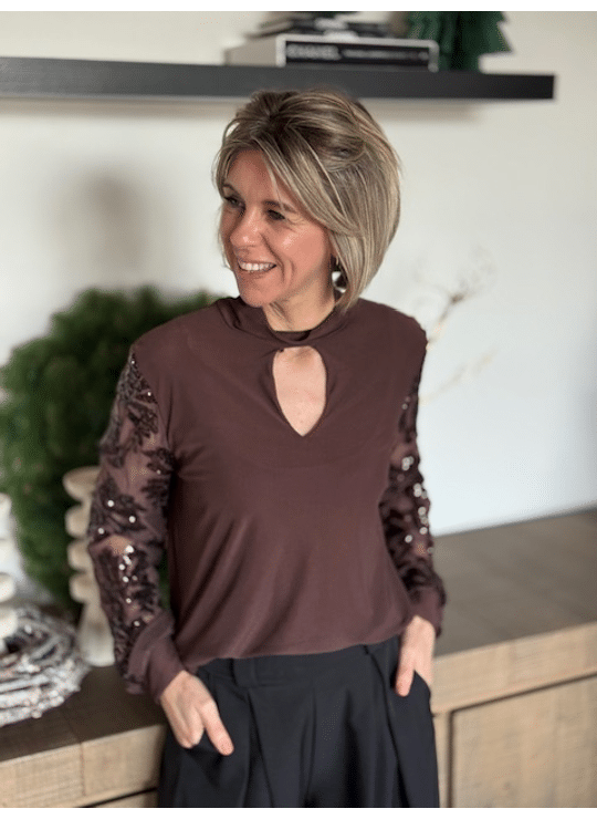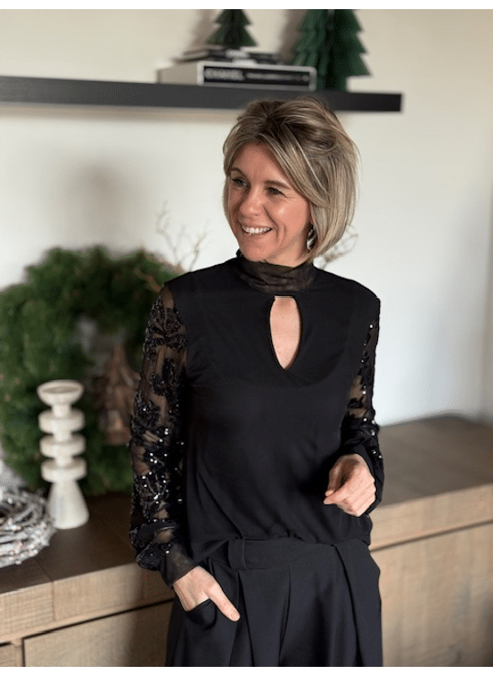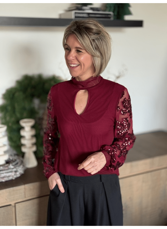 Voille top met een ingewerkte ondertop en paillettenmouwen, een subtiele keyhole-halslijn. Elegant en feestelijk!