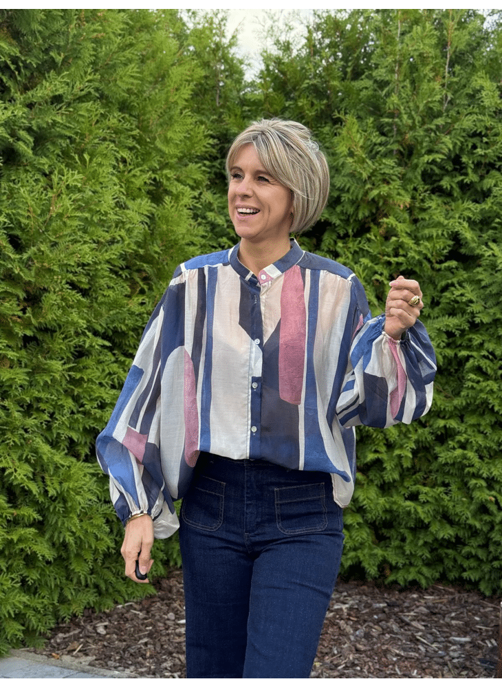 Oversized, licht doorschijnend hemd met een losse mouw met elastische band. Dit model valt iets korter qua lengte. Combineert mooi onder een spencer.