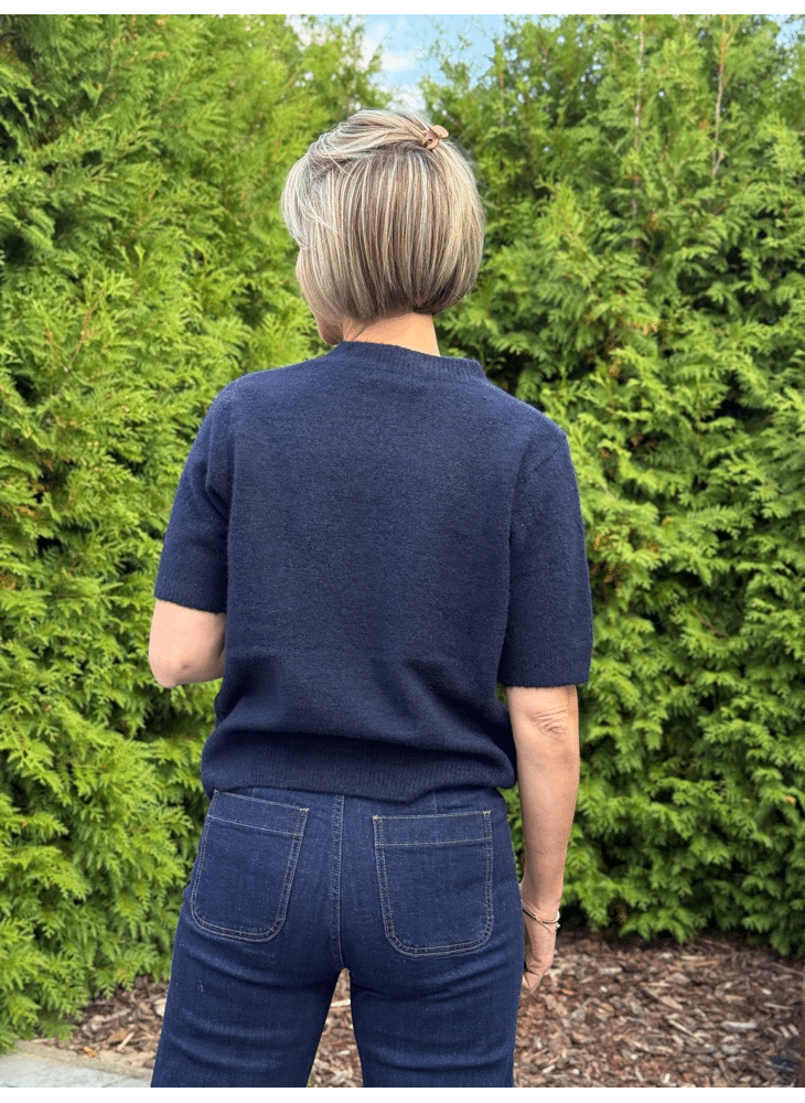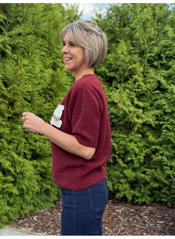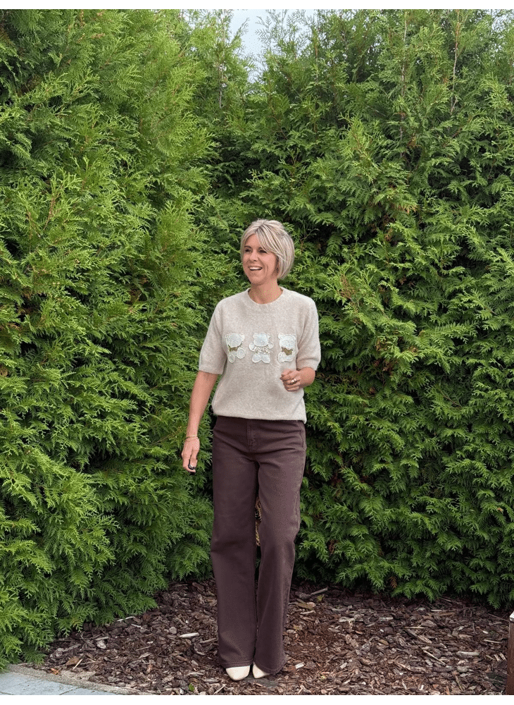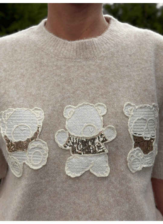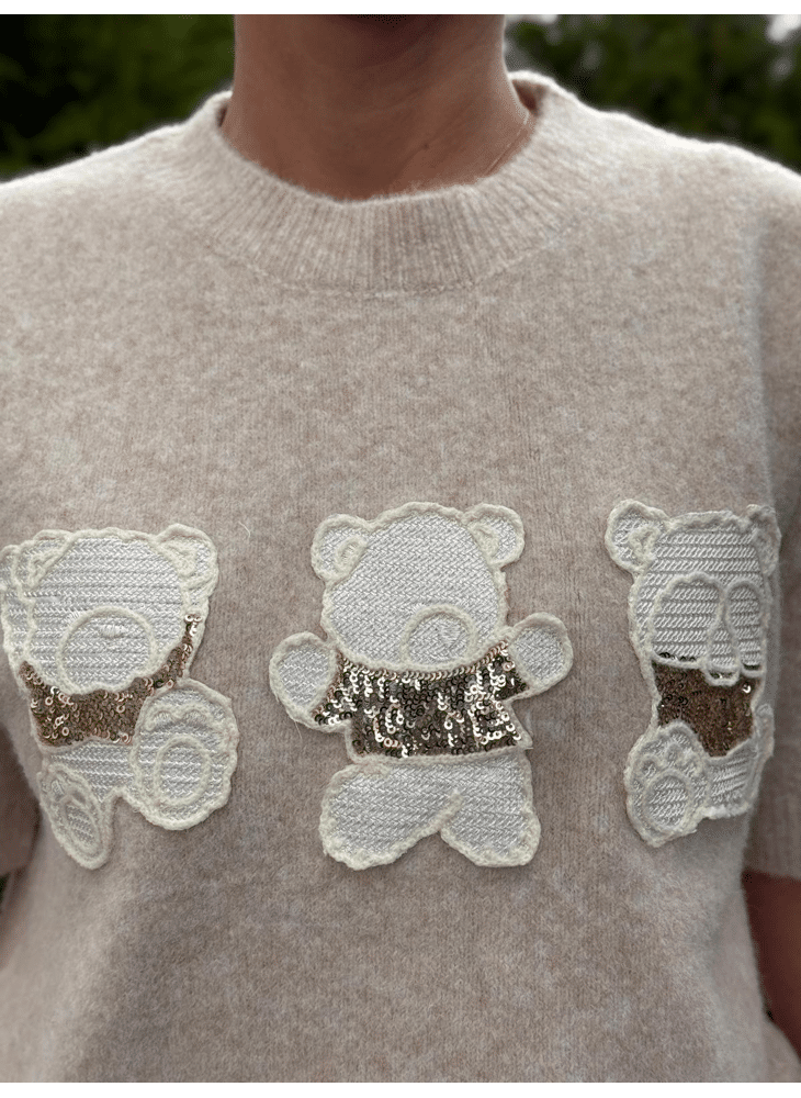 Pull met korte mouw en ronde hals. Er staat een supercute beertje op geborduurd waar fijne glitter pailletten zijn in verwerkt.