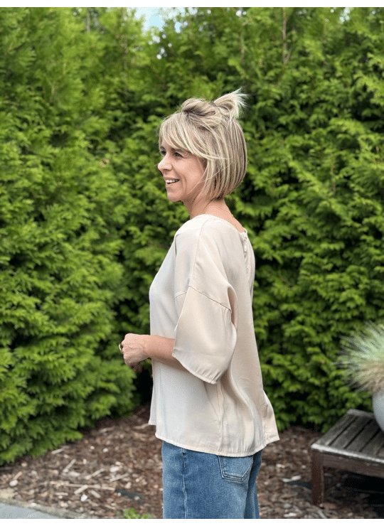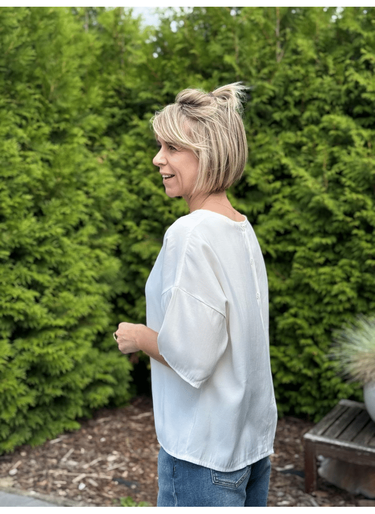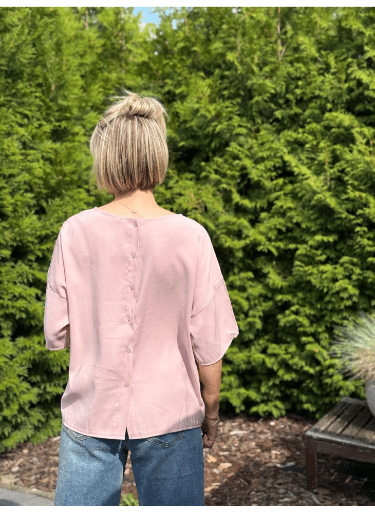 T-shirt met ronde hals en korte mouw. Dit model heeft knoopjes op de achterkant over de gehele lengte.