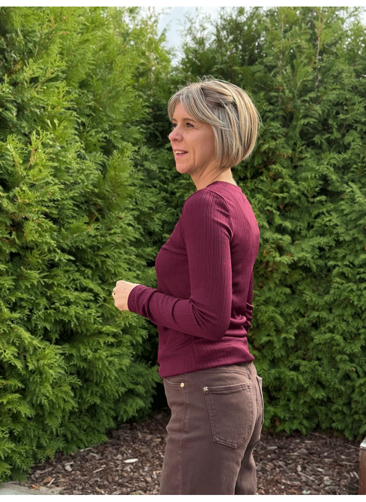 Aansluitende top met lange mouw en ronde hals. Dit stofje heeft een fijne ribbel en is stretchstof.