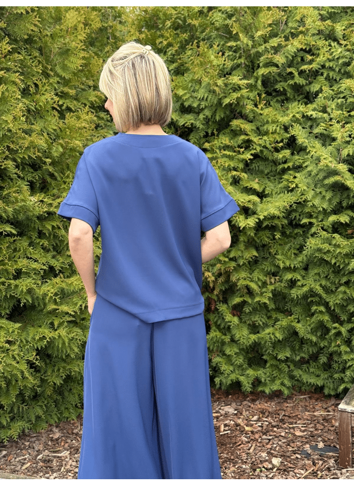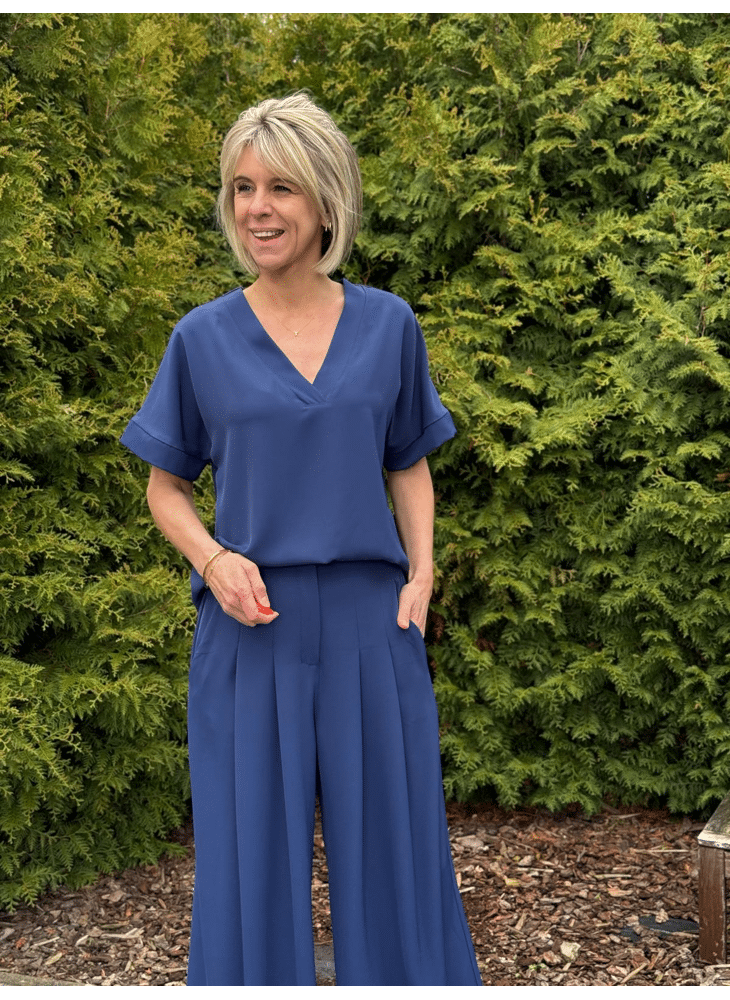 Blouse in t-shirt model met V-hals en korte mouw, recht model.