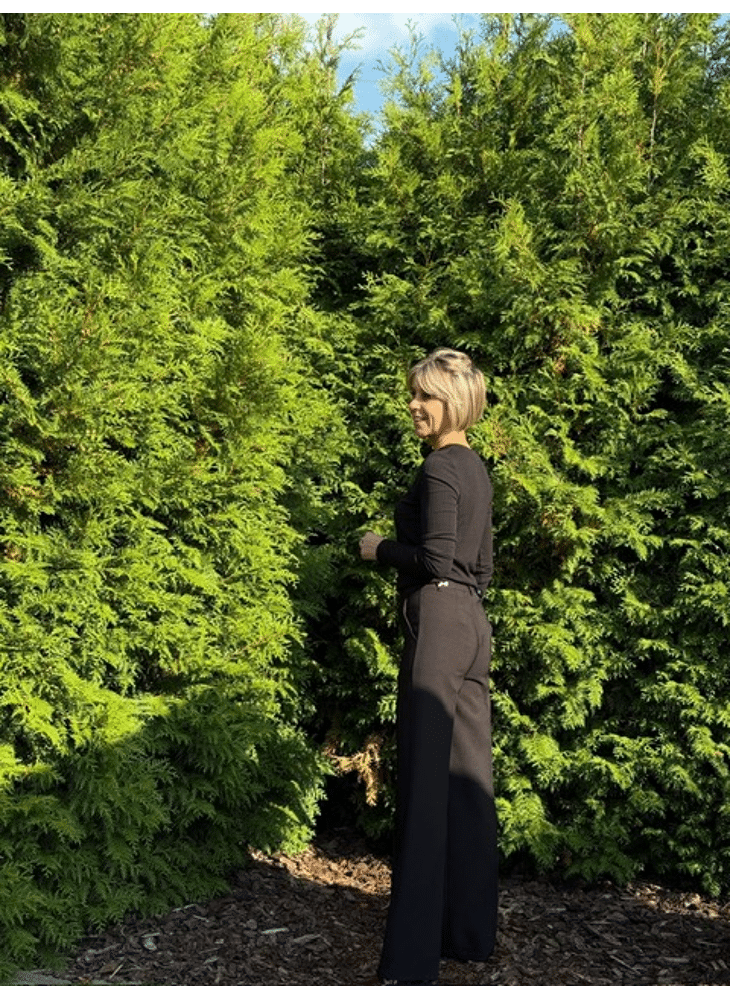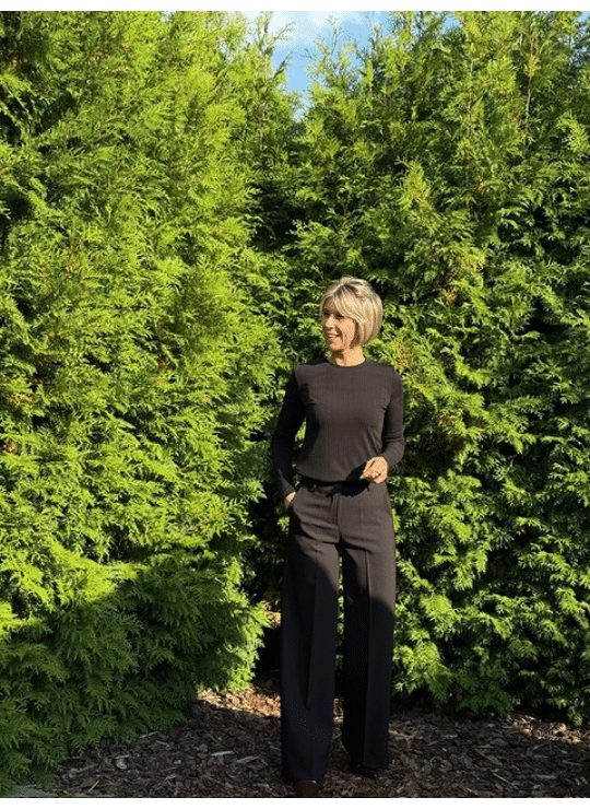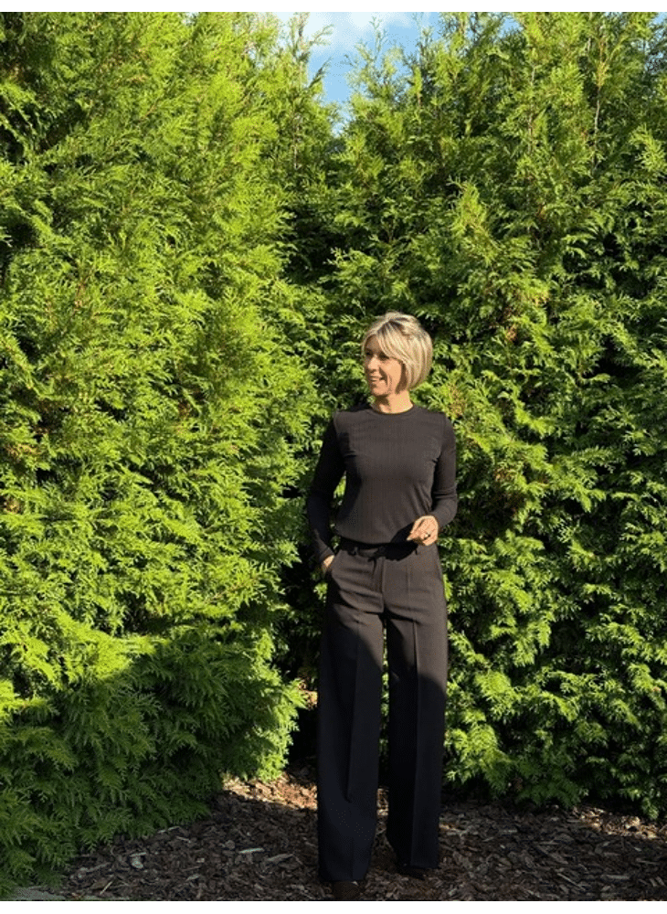 Geklede broek met een rechte, losse pijp met een plooi. Dit model heeft ook zakjes.