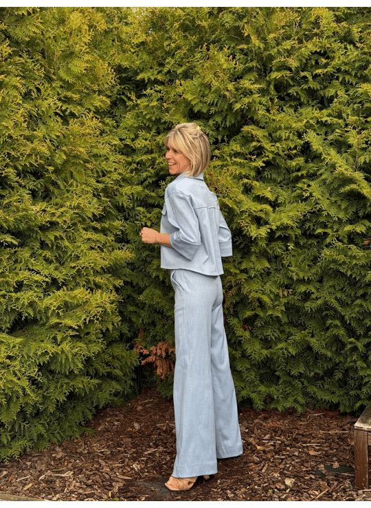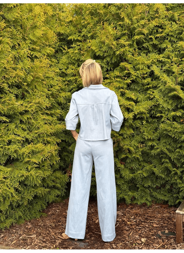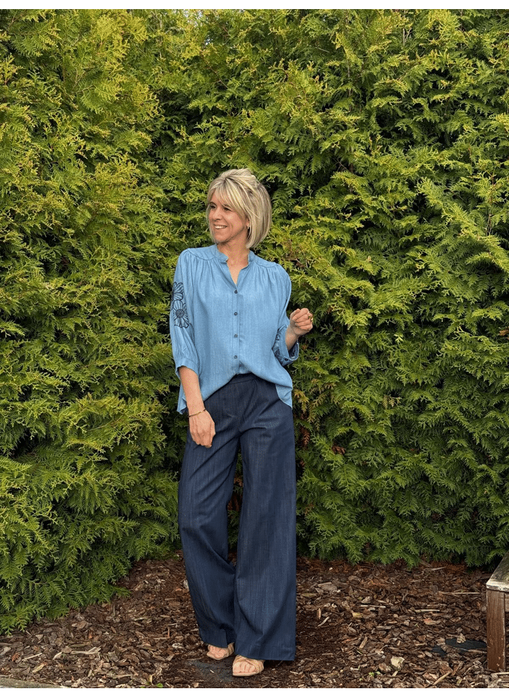 Losse fit met elastische band achteraan, zakjes. Is een jeansstof