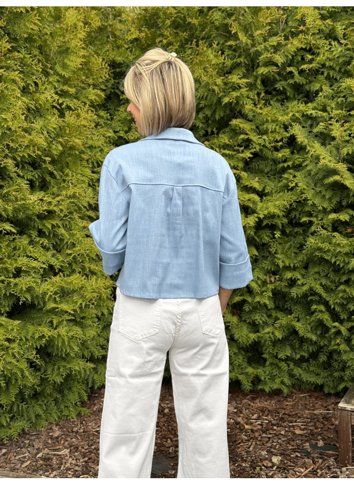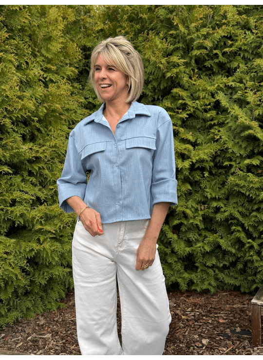Cropped hemd/jasje in jeans met knoopjes en driekwart mouw. Combineert mooi met dezelfde broek uit deze collectie voor een setje.