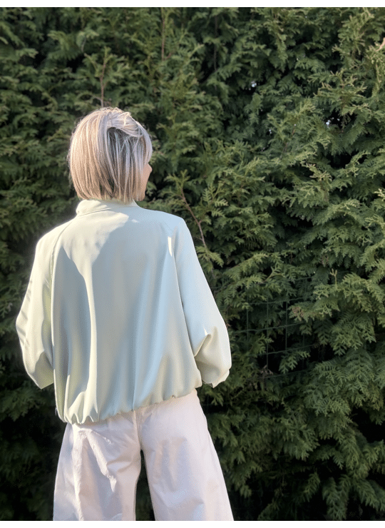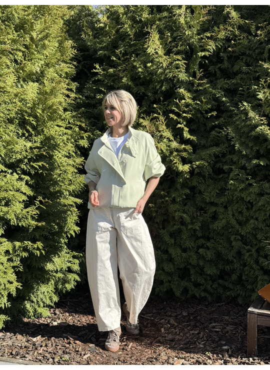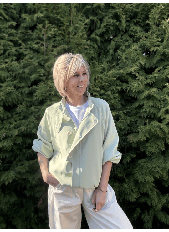 Ideaal jasje voor in de lente! Gevoerd, opstaand kraagje, zakjes en met een elastische band onderaan.