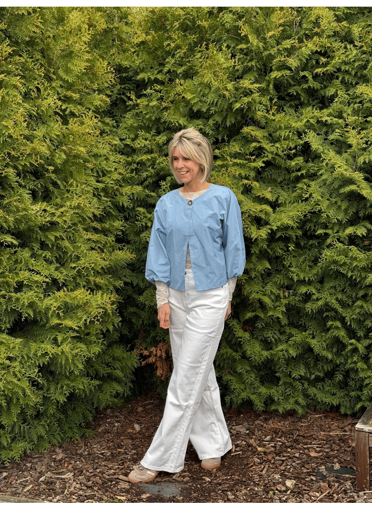 Cropped model, ronde hals, 1 knoop om te dichten, driekwart mouw met elastiek, gevoerd