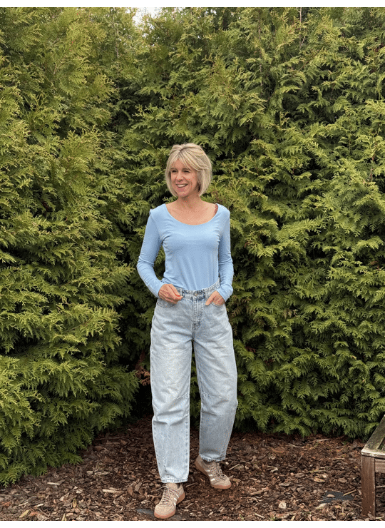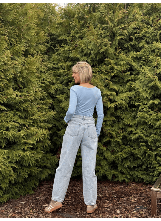 Jeans balloon model, highwaist, valt iets korter qua lengte.