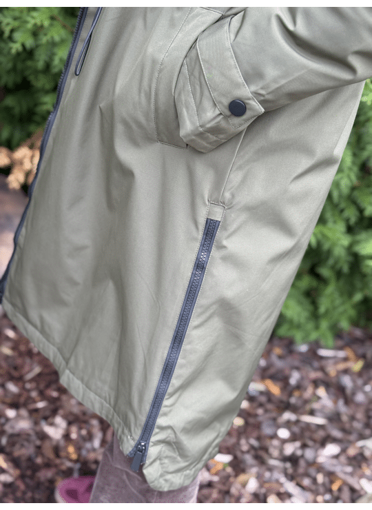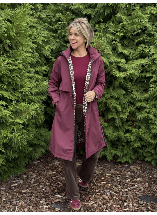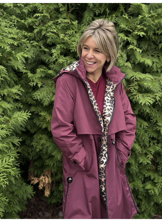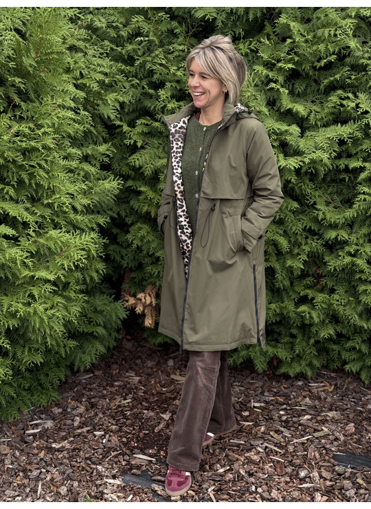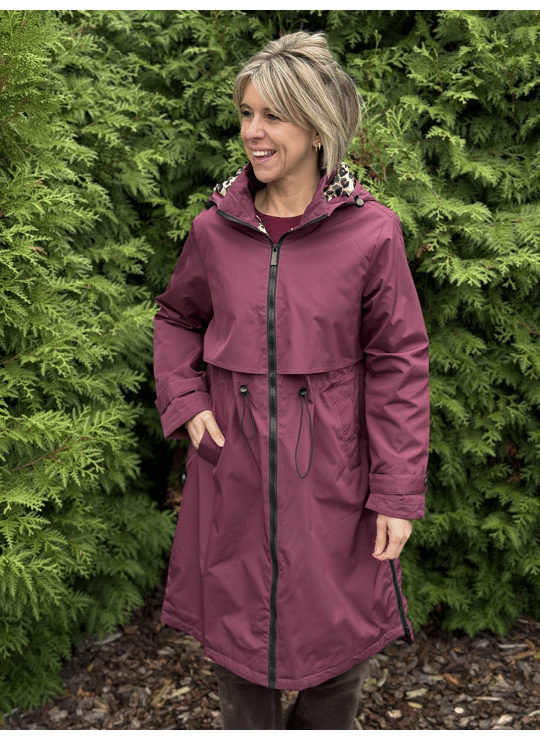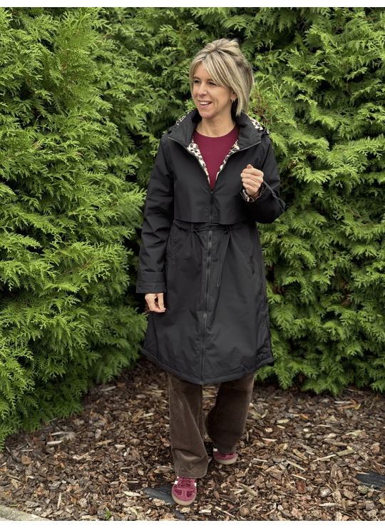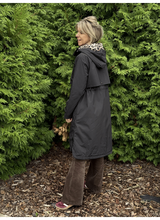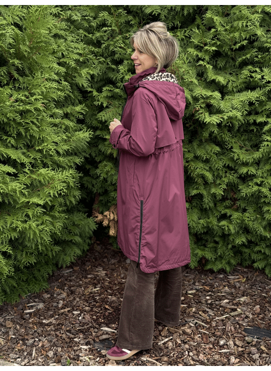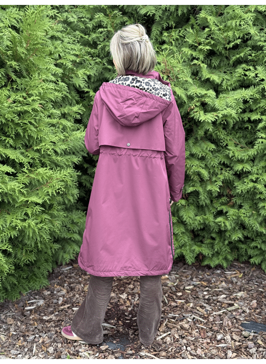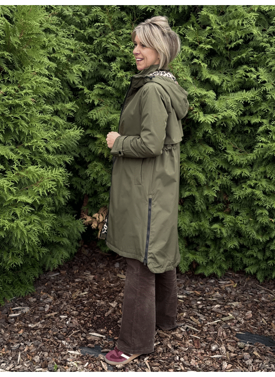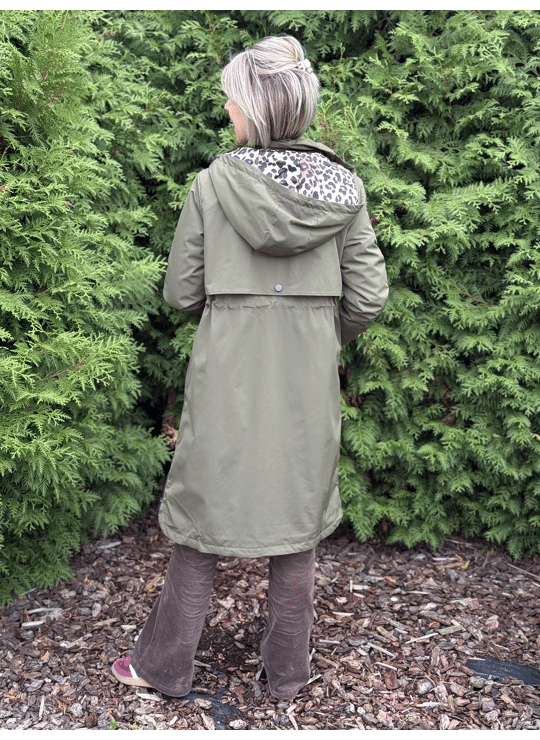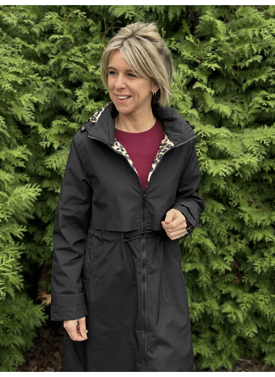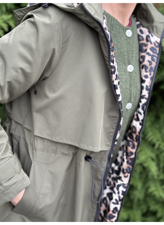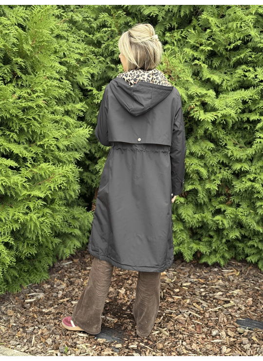Regenjas met kap en ritssluiting. Dit model valt lang, is gevoerd in een leopardprint en heeft een split langs weerszijde met een ritssluiting.
