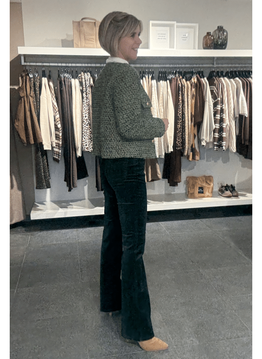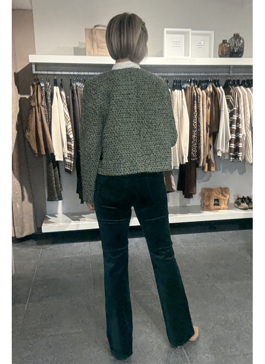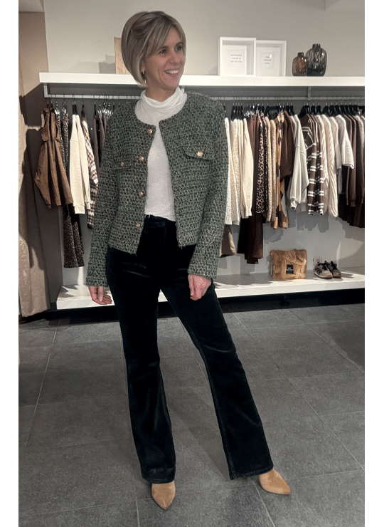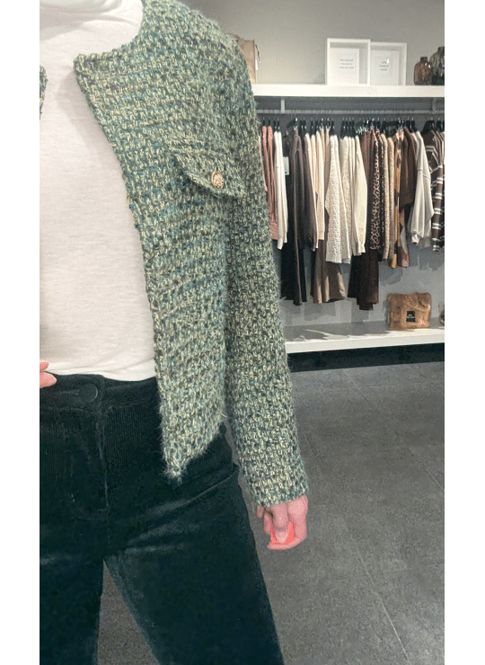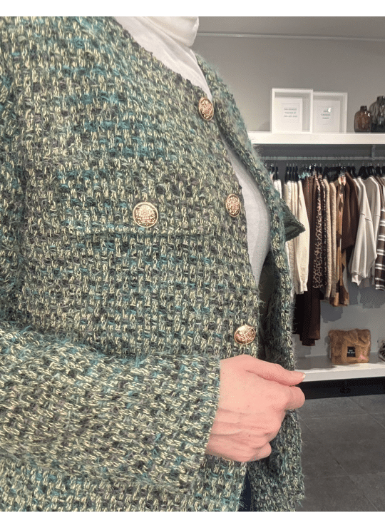 Kort, recht model in tweed, afgewerkt met gouden knoopjes. Dit model is gevoerd.
